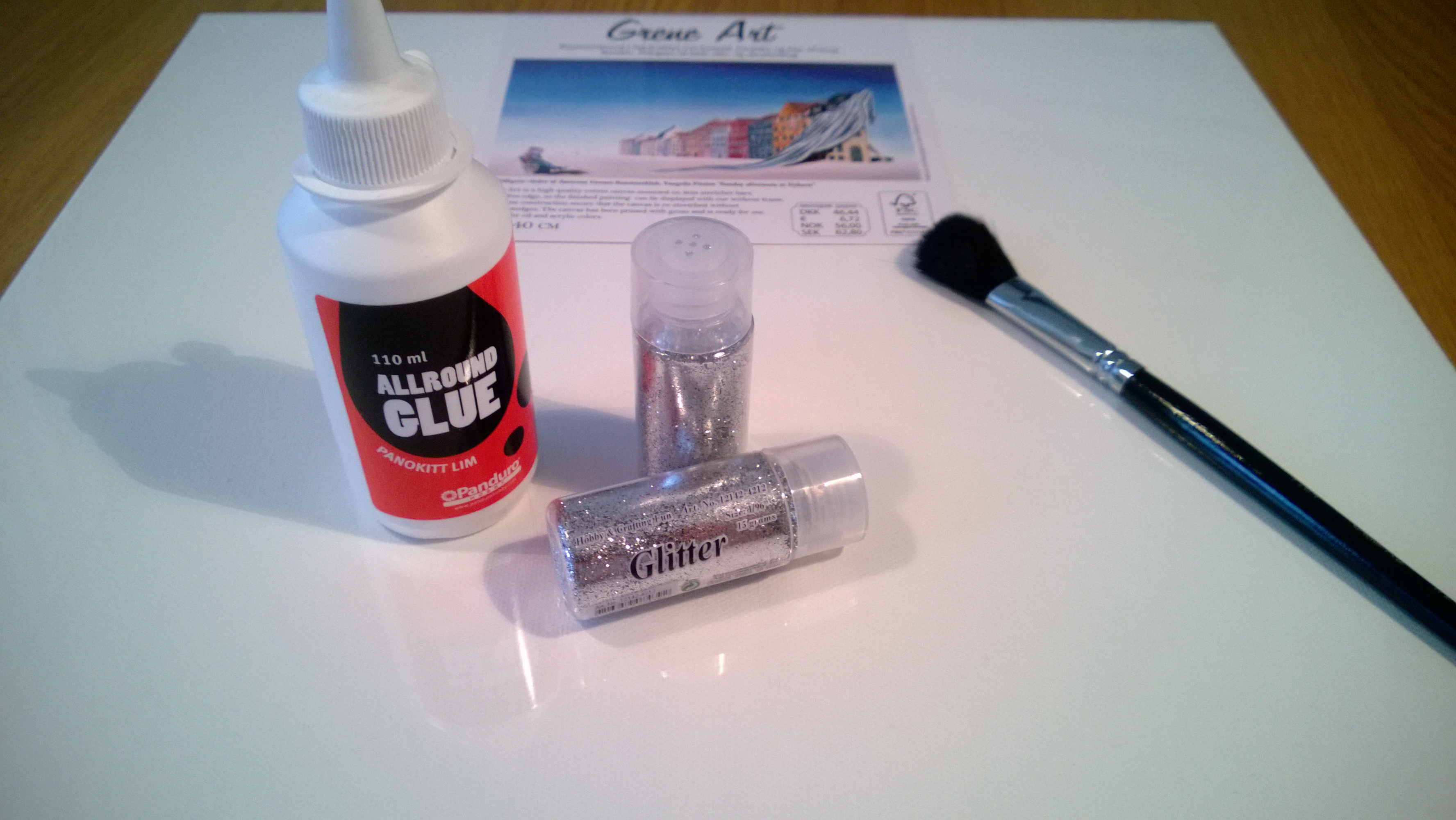 Material: eine Leinwand (ich habe mich für 40x40cm entschieden), Universalkleber (flüssig, am besten mit einer recht dünnen Dosierspitze), silber- oder goldfarbener Glitter zum Streuen (jede andere Farbe geht natürlich auch), schmaler Pinsel, Bleistift.